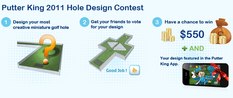 The 2011 Putter King Hole Design Contest ended on December 31st, 2011. Fans were encouraged to upload their most creative mini golf hole design for a chance to have their design featured in the Putter King Adventure Golf game on iOS and Android. Fans voted for their favorite designs and the top 3 designs with the most votes at the end of the contest were declared the winners. All three were built into the game.